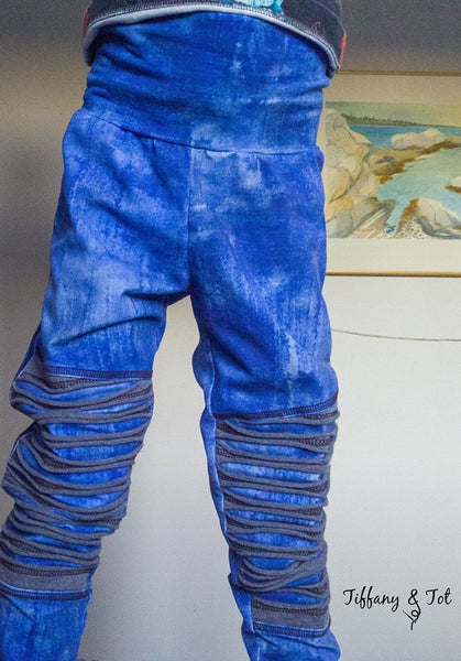 This Apple Tree pattern offers three Grow-With-Me sizes of: 3T - 6 years, 6-9 youth, and 9-12 youth These knit pants fit as a loose fit tapered pant or jogger on the smaller end of the size range and fit more like a legging/close fit pant as the child grows. The sizes are also adjustable through the use of foldable cuffs/legs and waist band. With a moto style knee patch option and a reversible option there are so many fun ways to create these grow-with-me pants.