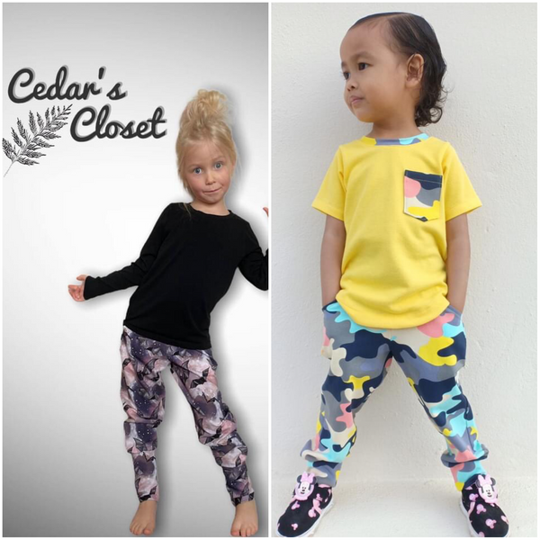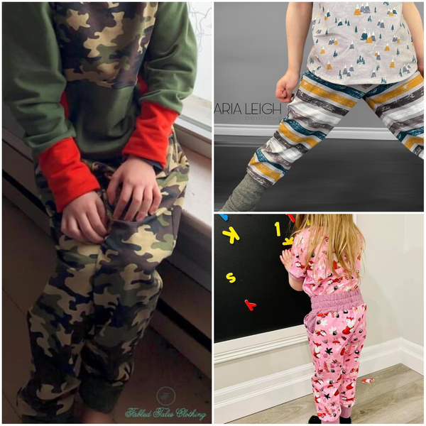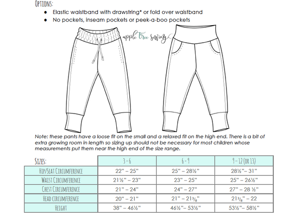 This grow with me Apple Tree sewing pattern includes three sizes: 3T - 6y, 6 - 9y, and 9 - 12y. These loose-fitting joggers can add style to any kid’s wardrobe. The SG Joggers are a great basic staple wardrobe piece. With 2 pocket options and 2 waistband options you can mix and match to make your perfect grow with me joggers. These joggers grow through the use of foldable cuffs, and a stretchy waistband. Creating grow with me clothing for the little ones in your life can make their custom clothes last up to 3 times longer than traditionally sized clothing.
