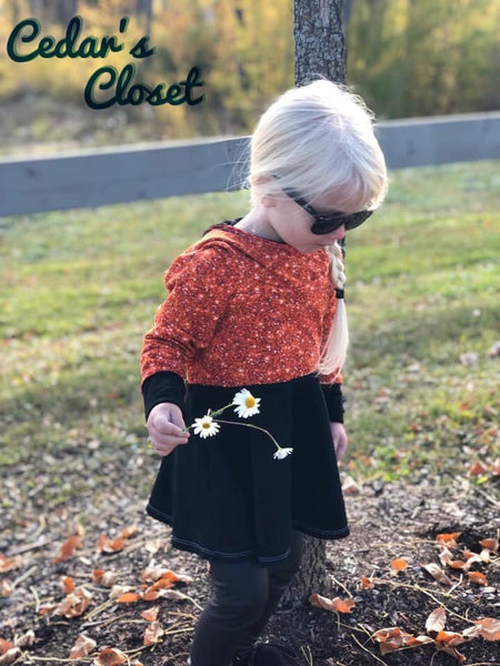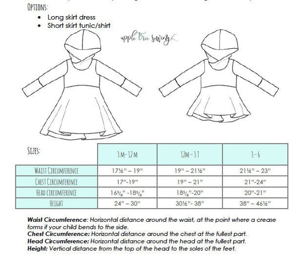 This Apple Tree pattern offers three grow with me sizes: 3-12 months, 12 months3T and size 3-6. With a fitted bodice, oversized hood and two skirt length options, this pattern is a great wardrobe staple. The sizes are adjustable through the use of foldable cuffs and a skirt that starts long and gets shorter as they grow. The longer length dress option starts below the knees and grows to a shorter dress (above the knees). The shorter length dress option starts at a short dress/tunic length and grows to a shirt length. These patterns create clothing that lasts longer than traditionally sized clothing because of the grow with me sizing.
