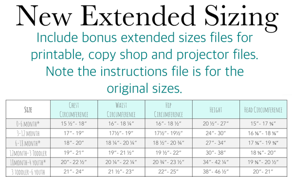 This pattern now includes 4 Bonus files for the extended sizes. The bonus files are the size chart, printable files, A0 file and projector file for sizes 0-6m, 3-12m, 6-18m, 12m-3T, 18m-4T, & 3-6T.