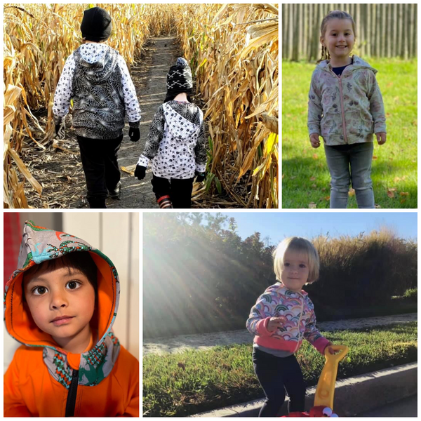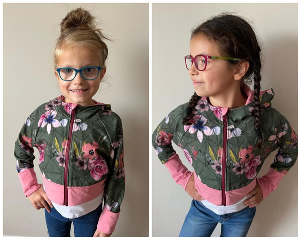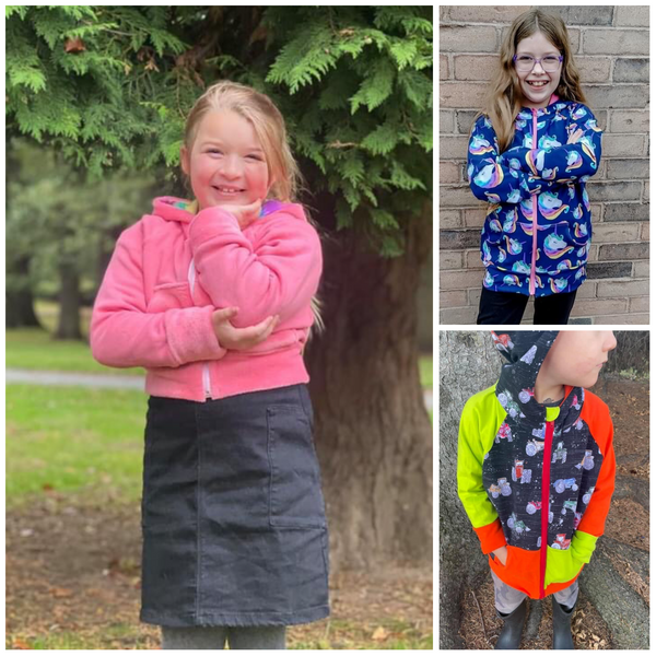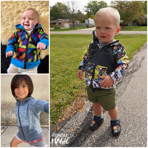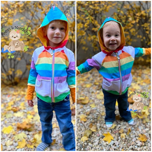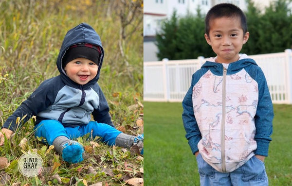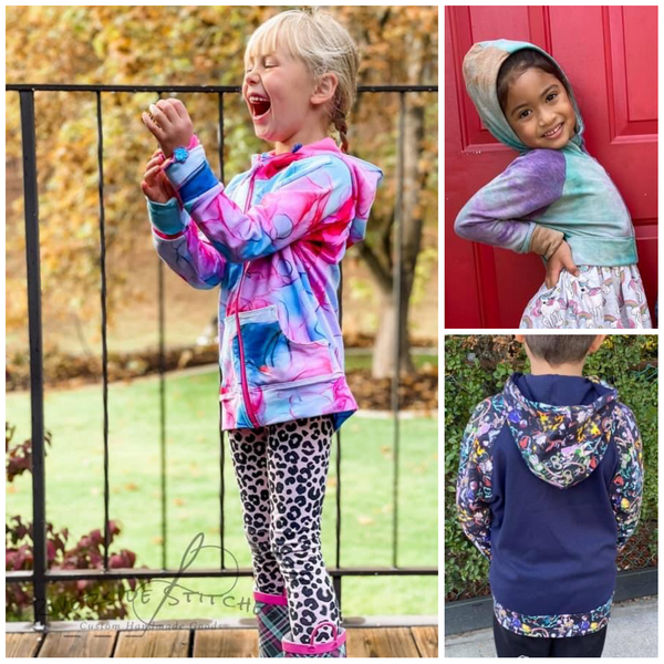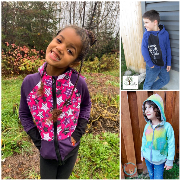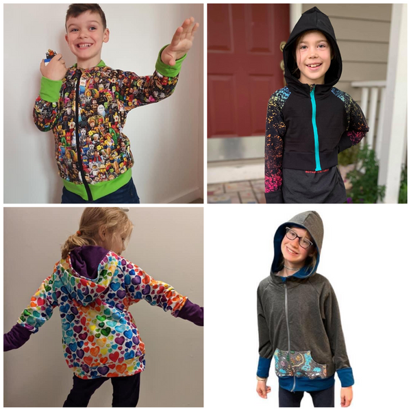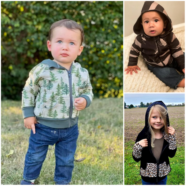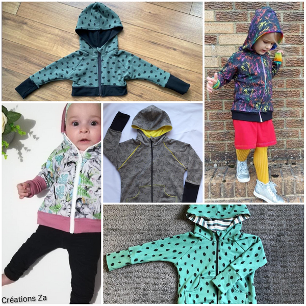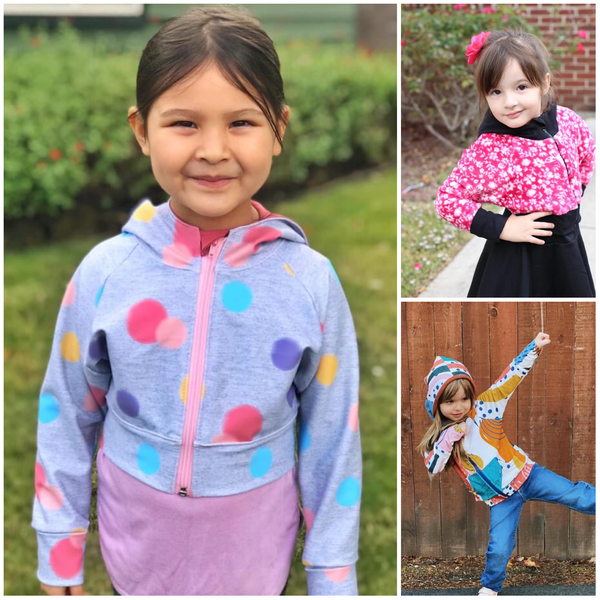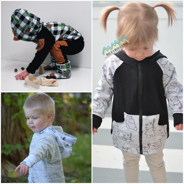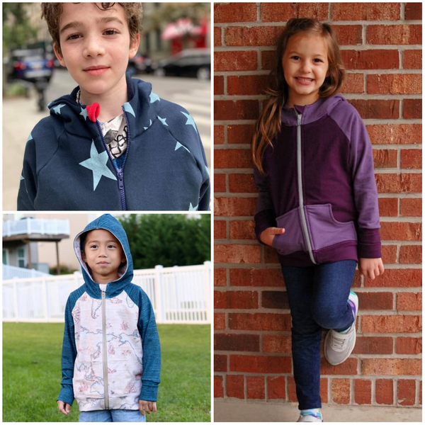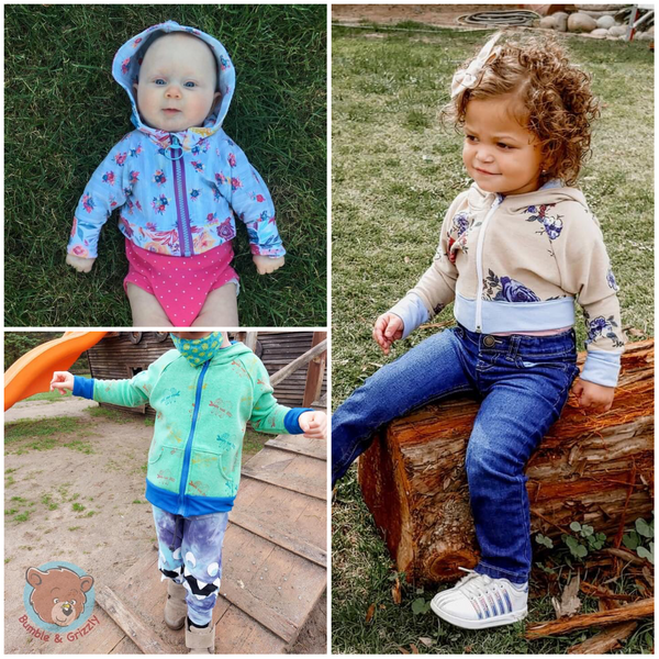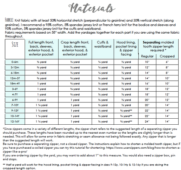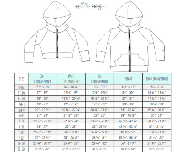 This pattern offers 12 grow with me sizes from 0-6 months up to 12-16 youth. This is our new size set so includes even more grow with me sizes! The sizes are adjustable through the use of foldable cuffs. The regular length hooded zip up raglan grows from a tunic length on the low end of the size range to a shirt length on the high end of the size range. The cropped option grows from a longer cropped length to a shorter cropped length. Because of the grow with me sizing, these patterns last up to 3 times longer than traditionally sized clothing.