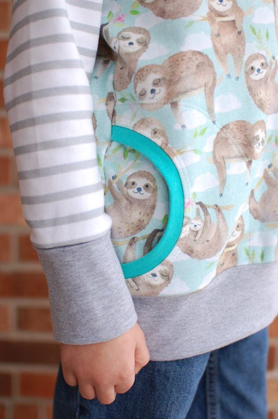 This cute Grow-With -Me Bunnyhug PDF pattern includes three grow with me sizes: 3T - 6y, 6 - 9y and 9 - 12/13y. Just roll the cuffs and waistband up for the smaller sizes and unroll as your little one grows. The fun peekaboo pocket is great for using up those little knit scraps you've been saving.