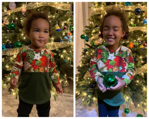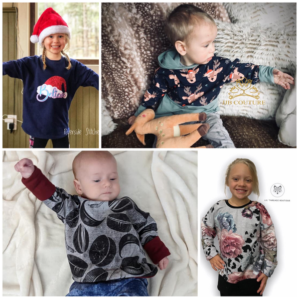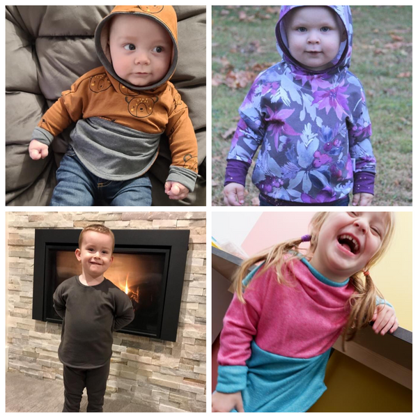 This grow with me sewing pattern includes three sizes: 3 - 12m, 12m - 3T, and 3T - 6y. This dolman top grows from an oversized fit to a relaxed slouchy fit in the body. This pattern is looser than most of our other patterns. The sleeve length can be changed (“grow”) by rolling up and unrolling the cuff. The length grows from a tunic length to a shirt length. This grow with me dolman top has two options for neckline (unlined scuba hood or crew neck), two options for sleeve length (long sleeve or short sleeve), two options for bodice length (hemmed length or waistband) and a fun color blocked option!