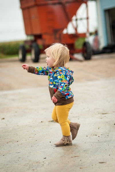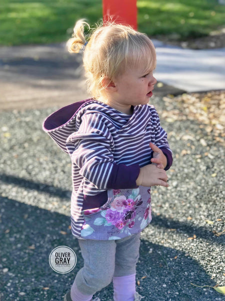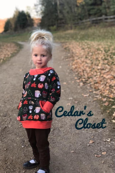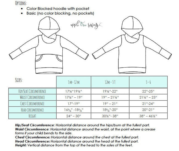 This Apple Tree pattern offers three grow with me sizes: 3-12 months, 12 months3T, and size 3-6. With two fun options, this pattern is a great wardrobe staple. The sizes are adjustable through the use of foldable cuffs and waistband. The hoodie fits as an oversized sweater and grows to a more fitted look. Grow with me patterns create clothing that lasts longer than traditionally sized clothing.