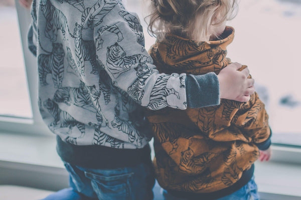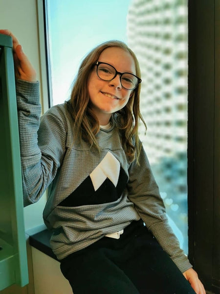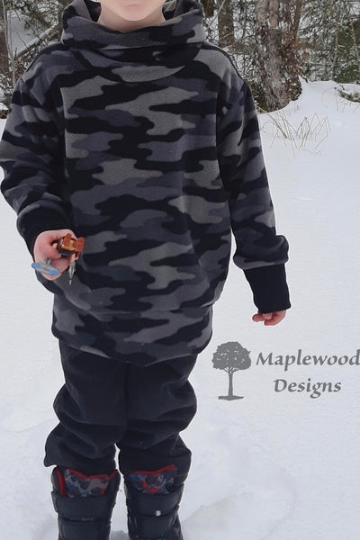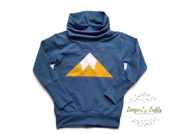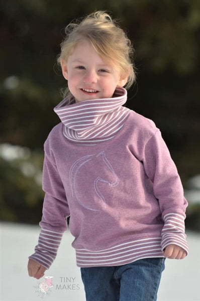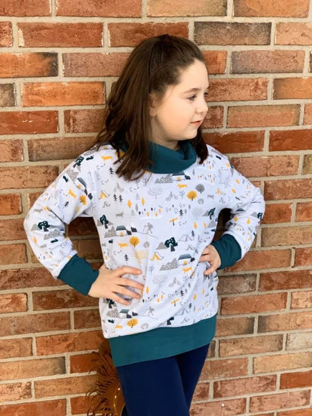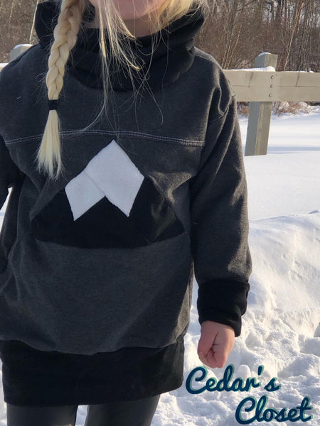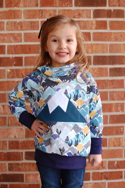 This pattern offers five grow with me sizes: 3-12 months, 12 months–3T, size 3-6, size 6-9 and size 9-12. With a cute color blocked mountain feature, this pattern is a fun piece to create. With an option to add a cowl* or have a crew neck, there are lots of fun combinations. The grow with me sizes are adjustable through the use of foldable cuffs and an extra long waistband that grows from a tunic length to a sweatshirt length. The hoodie fits as an oversized sweater and grows to a more fitted look. Grow with me patterns create clothing that lasts longer than traditionally sized clothing.