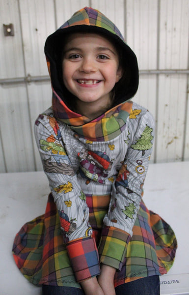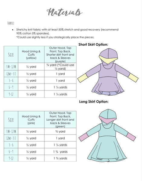 This Apple Tree pattern offers five grow with me sizes: 3-12 months, 12 months3T, size 3-6, size 6-9 and size 9-12. With a fitted bodice, oversized hood and two skirt length options, this pattern is a great wardrobe staple. The sizes are adjustable through the use of foldable cuffs and a skirt that starts long and gets shorter as they grow. The longer length dress option starts below the knees and grows to a shorter dress (above the knees). The shorter length dress option starts at a short dress/tunic length and grows to a shirt length. These patterns create clothing that lasts longer than traditionally sized clothing because of the grow with me sizing.