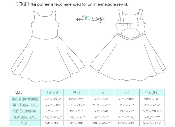 This Apple Tree Sewing Pattern offers five grow with me sizes: 3-12 months, 12 months-3T, size 3T-6y, size 6-9 and size 9-12y. The sizes are adjustable through the use of snaps on the shoulder straps and back straps. The shorter length dress starts just above the knees and grows to a longer tunic length. The longer length dress starts below the knees and grows up to about knee length. Because of the grow with me sizing, these patterns last up to 3 times longer than traditionally sized clothing.